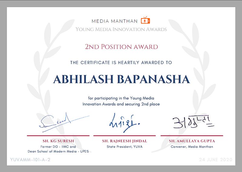 Awarded 2nd prize in Promising News Anchor Category of the YUVA Media Manthan Young Media Innovation Awards 2020